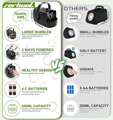 Elevate the fun at any gathering with the Zerhunt Bubble Machine. This 2024 upgraded bubble blower generates over 18,000 vibrant, colorful bubbles per minute with its six spinning wands, creating a magical atmosphere. Whether indoors or outdoors, it’s a hit with kids, toddlers, and even pets. Built from high-quality ABS material, it ensures safety and durability. Its large 320ml bubble solution tank provides up to 30 minutes of continuous bubble-making. Powered by batteries, a plug-in adapter, or a power bank, it’s versatile and perfect for parties, birthdays, weddings, or outdoor play.