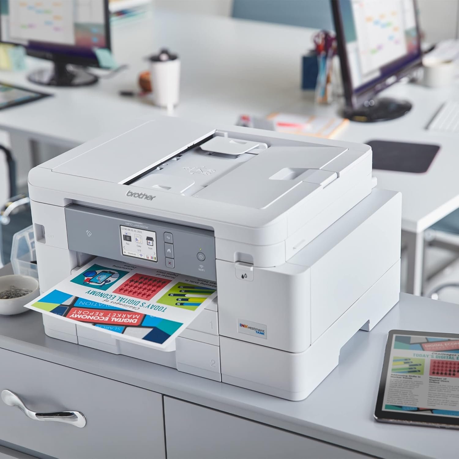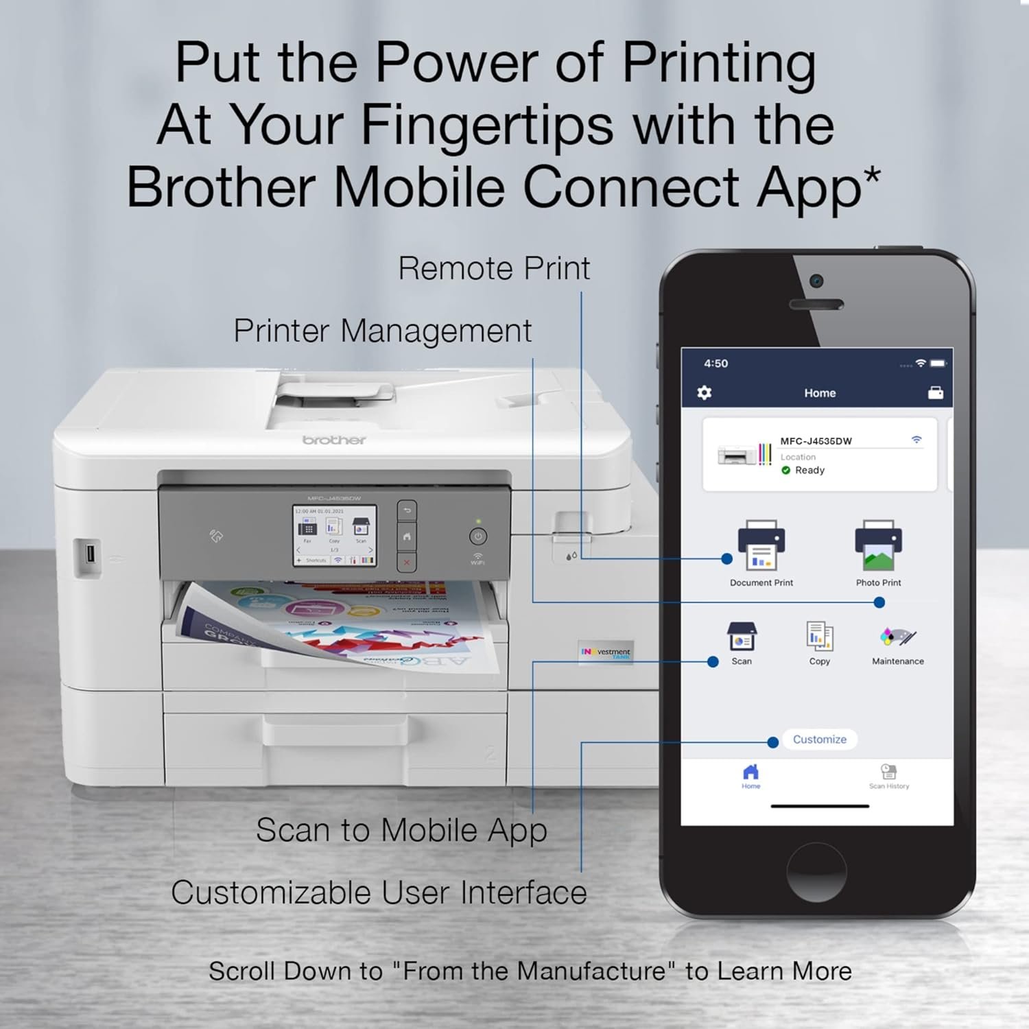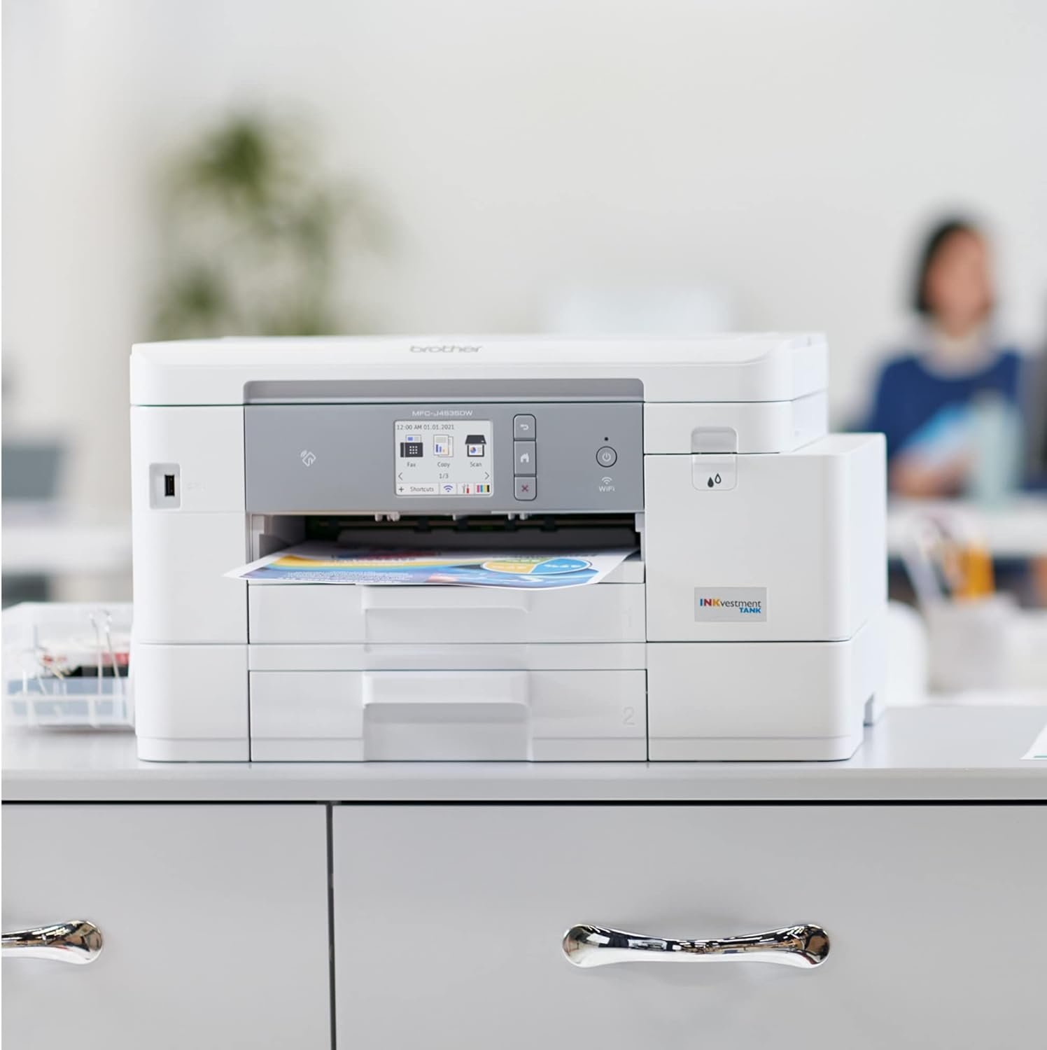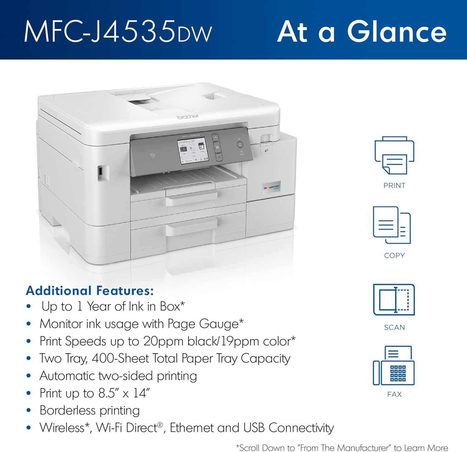 The Brother MFC-J4535DW INKvestment Tank printer offers auto-duplex printing, wireless and NFC connectivity, and a high-yield ink system for cost-effective printing.