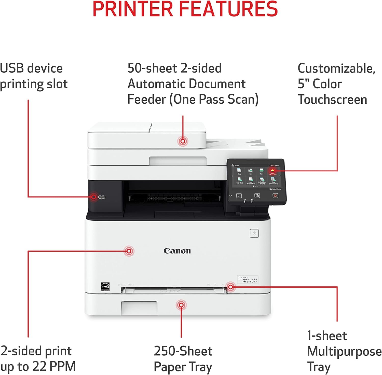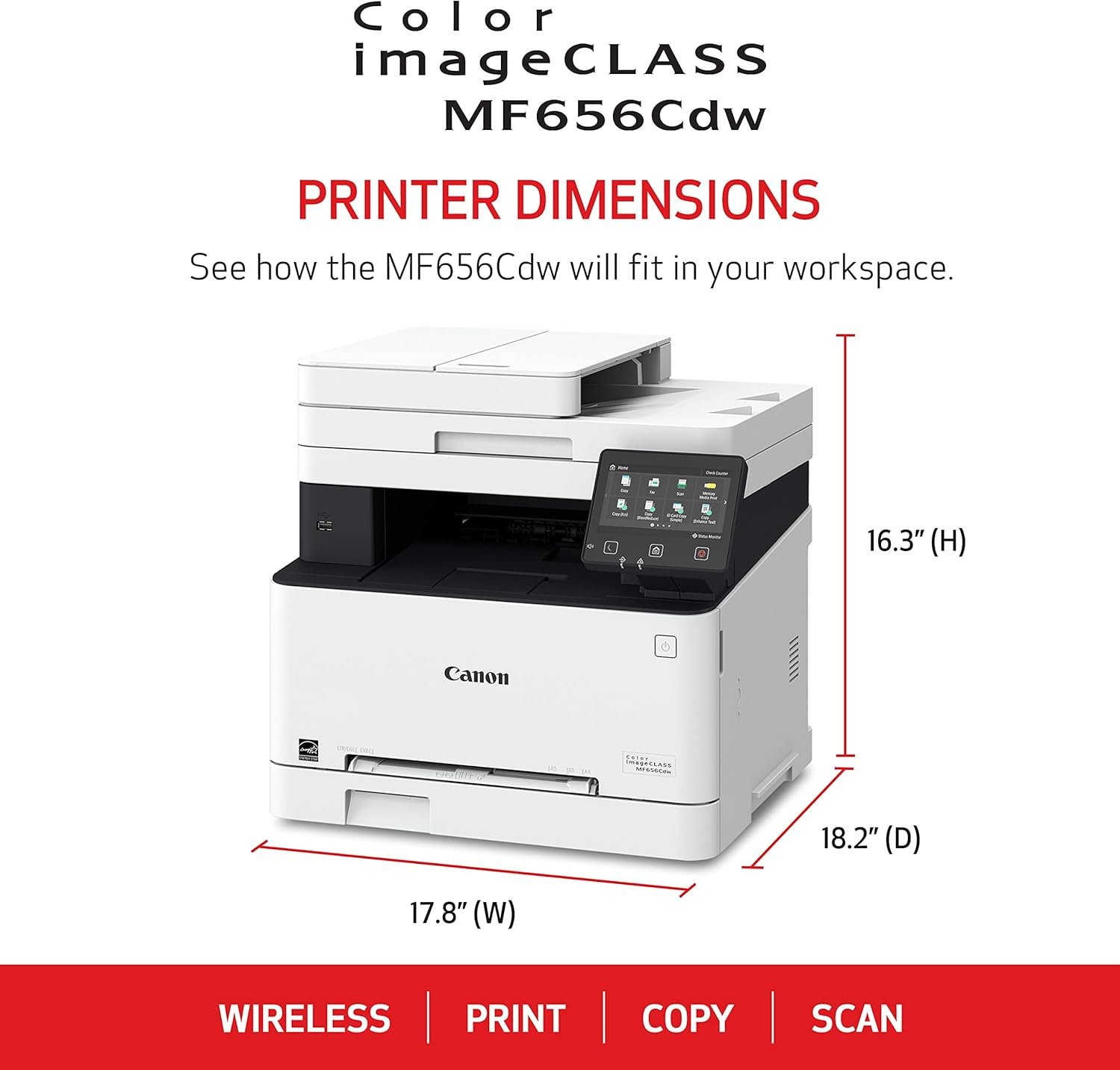 9.1/10 (Expert Score)The Canon Color imageCLASS MF656Cdw is a wireless all-in-one laser printer with auto-duplex printing, a touchscreen display, and a 50-sheet auto document feeder for high-quality productivity.