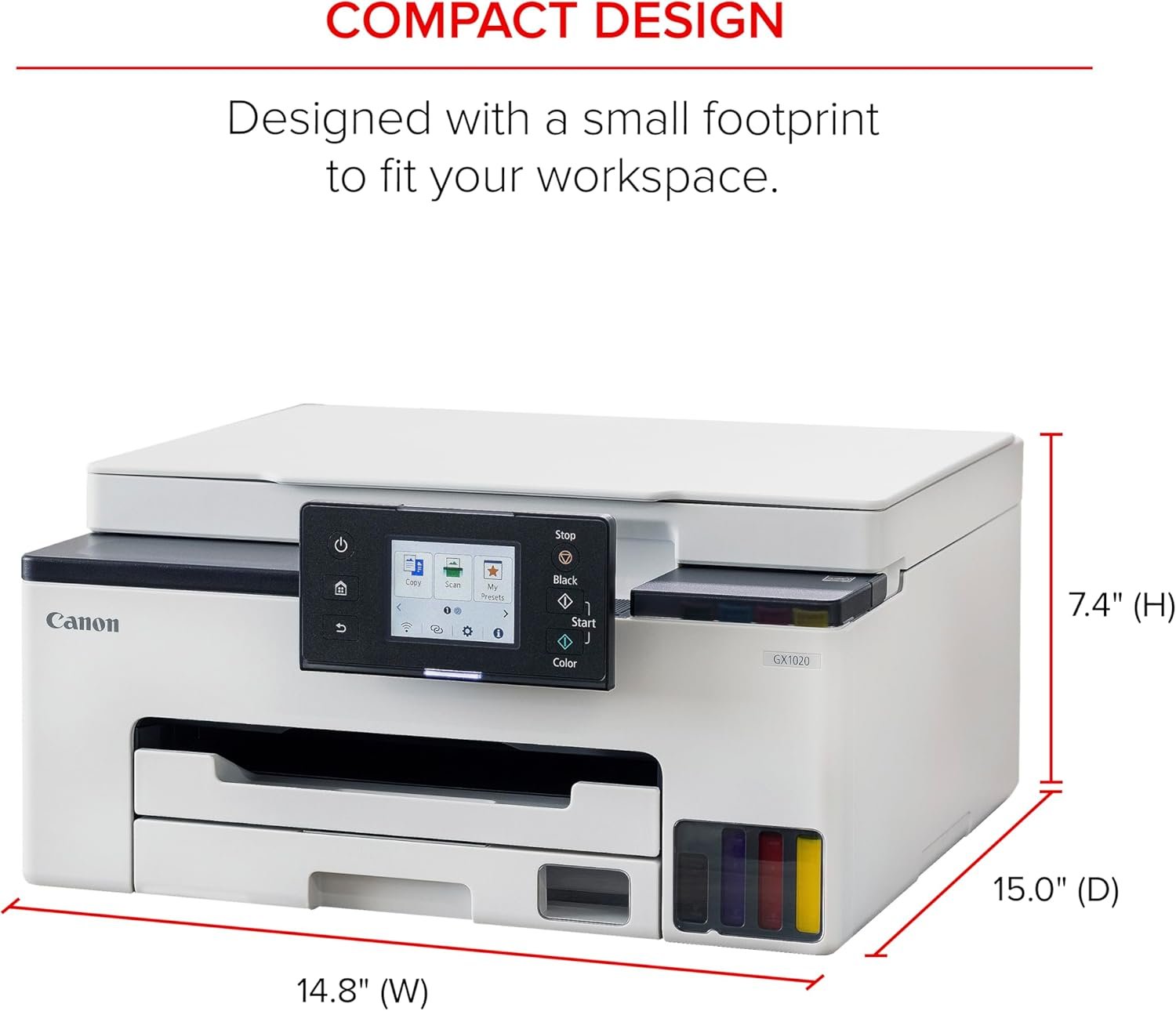 The Canon MAXIFY GX1020 is a high-efficiency all-in-one wireless MegaTank printer designed for home offices and small businesses. Featuring a refillable ink tank system, this printer offers exceptional cost savings and reduces the need for frequent cartridge replacements. It supports printing, copying, and scanning, delivering crisp text and vibrant color prints with ink designed for business-quality documents.