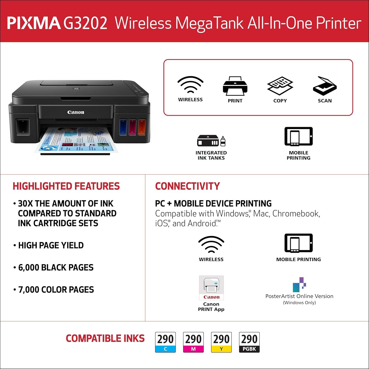9/10 (Expert Score)The Canon PIXMA G3202 is a wireless MegaTank all-in-one printer with refillable ink tanks, borderless printing, and mobile connectivity for cost-efficient, high-quality printing.