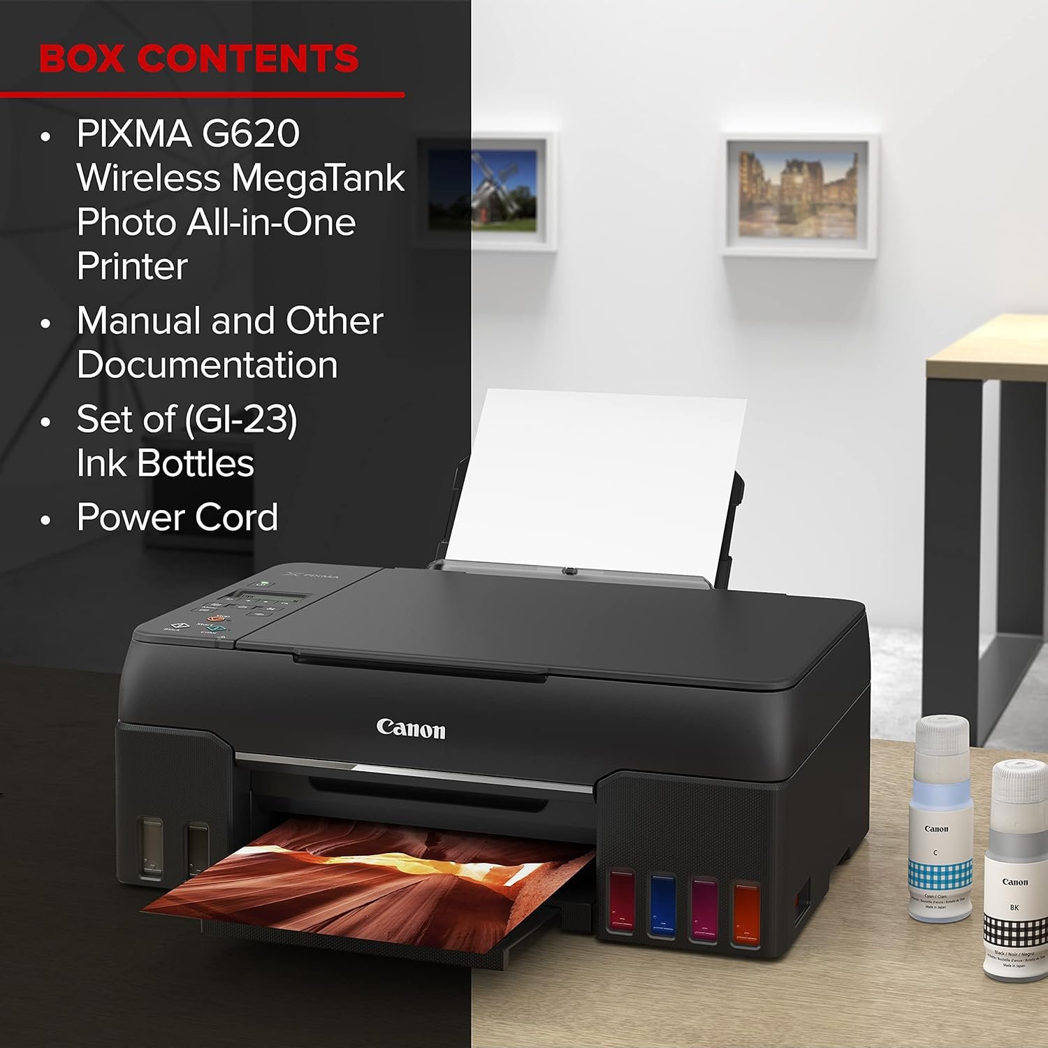 The Canon PIXMA G620 is a wireless MegaTank all-in-one printer designed for high-quality photo printing, scanning, and copying. Featuring an advanced six-color dye-based ink system, this printer delivers vibrant, detailed, and true-to-life images, making it perfect for photography enthusiasts and home users who require professional-grade prints. Its high-capacity MegaTank ink system significantly reduces printing costs, allowing you to print up to 3,800 4″x6″ photos on a full set of ink bottles.