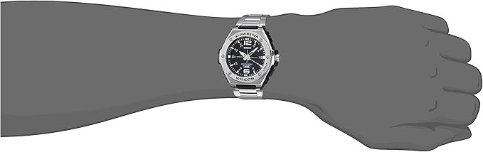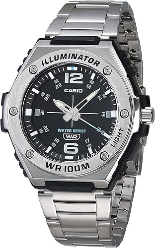 The Casio MWA100H Series men’s analog watch is designed for durability and style. Featuring a robust stainless steel bezel, a resin case, and a resin glass face, this watch is built for both form and function. With 100M water resistance and an LED illuminator backlight with afterglow, it’s perfect for outdoor and daily use. The triple-fold clasp ensures a secure fit, while the quartz movement provides reliable timekeeping. A 3-year battery life further enhances its convenience and dependability.