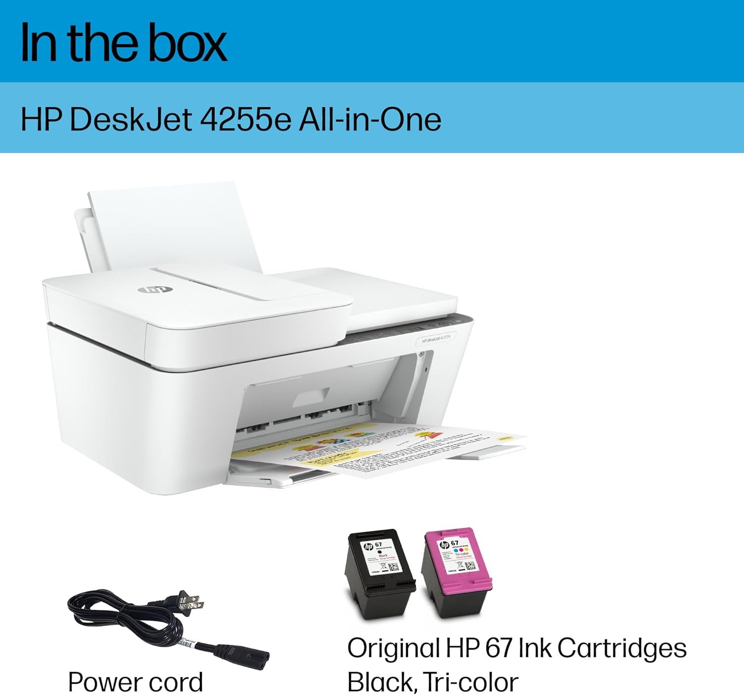 The HP DeskJet 4255e is a wireless all-in-one printer, scanner, and copier designed for home use, with 3 months of Instant Ink included.