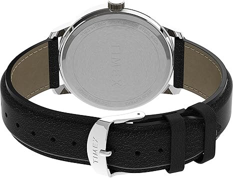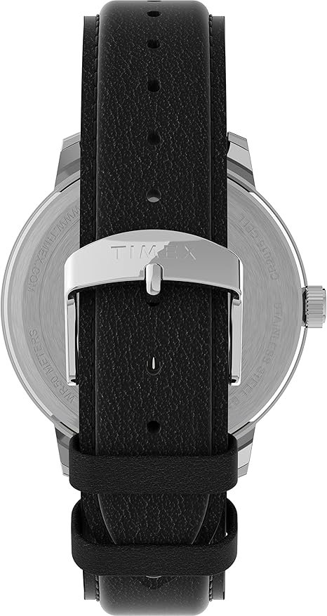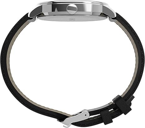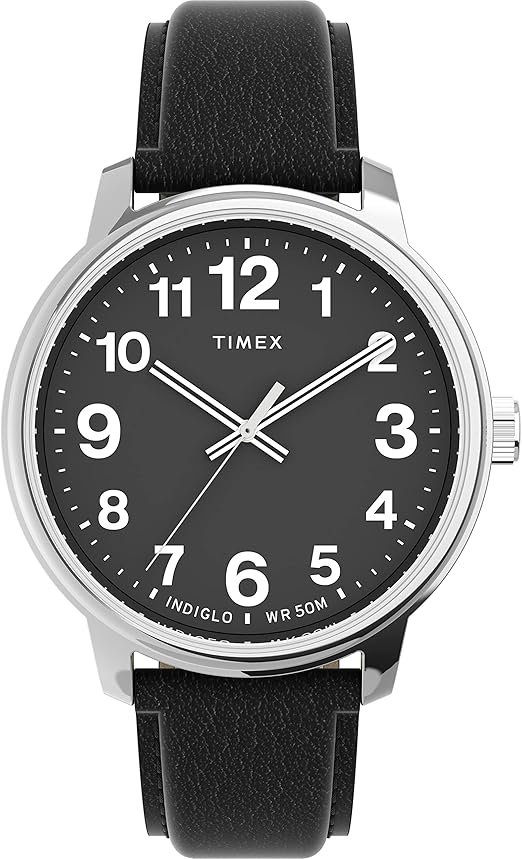 The Timex Men’s Easy Reader Watch offers timeless style and practicality. Featuring a 43mm silver-tone brass case, a black dial with bold white full Arabic numerals, and silver-tone hands, this watch ensures optimal readability. The adjustable 20mm genuine black leather strap provides comfort and fits wrists up to 8 inches in circumference. With an Indiglo light-up dial for low-light visibility and water resistance up to 50 meters, it is perfect for everyday wear.