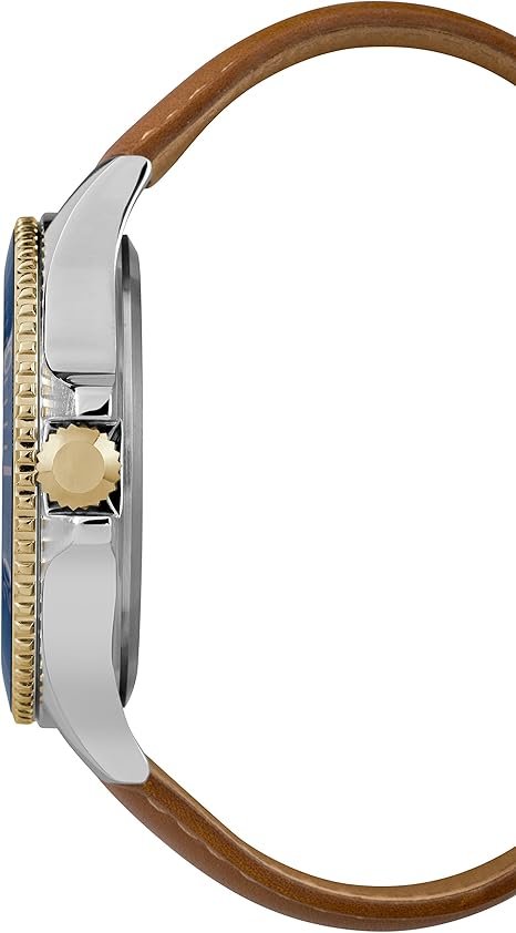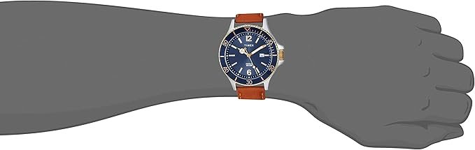 The Timex Men’s Harborside Watch combines a classic design with modern functionality. Featuring a 42mm brass case and a stylish blue dial, this watch has partial Arabic numerals and a date window at 3 o’clock. The watch is equipped with a 20mm genuine leather strap that fits up to an 8-inch wrist circumference for a comfortable and adjustable fit. Its Indiglo light-up dial and luminous hands make it easy to read in the dark. Water-resistant up to 50 meters, it is ideal for light swimming or recreational water activities.