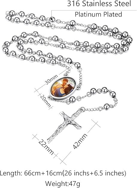 Create a meaningful keepsake with the Custom4U Personalized Rosary with Picture. This stainless steel rosary features a customizable photo pendant and an option to engrave names, dates, or inspirational messages. With high-quality 316L stainless steel material and a protective glass covering the pendant, this 26-inch rosary is hypoallergenic and durable. Perfect for memorializing loved ones, it’s an ideal gift for special occasions like anniversaries, Mother’s Day, or Christmas.